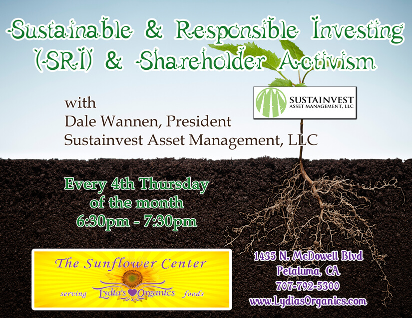 I will be giving an informal chat on How to be an Activist Shareholder this Thursday the 25th at Lydia’s Sunflower Center at 6:30pm.  If you’re interested in learning about socially and environmentally conscious investing and what a “shareholder proposal” is and the history behind them and how to file one yourself then stop on